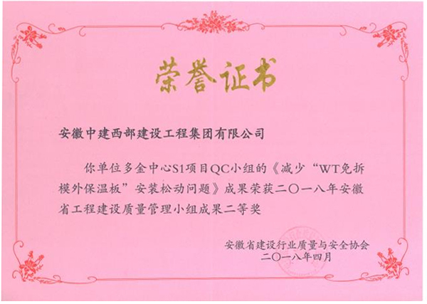 2018年度QC成果榮獲安徽省建筑業(yè)優(yōu)秀質(zhì)量管理獎(jiǎng)項(xiàng)