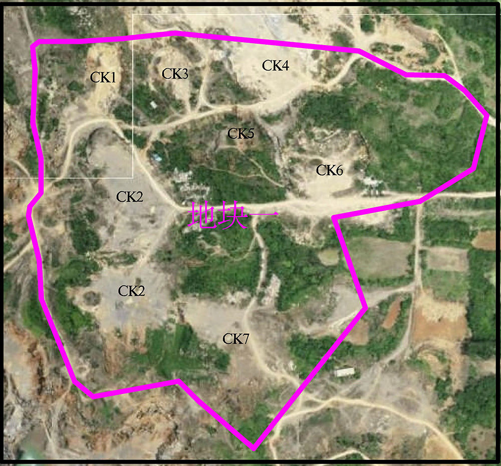 1、地塊一東西長約423米、南北寬約400米,面積0.1200平方千米,整體地勢西高東底,地面標高約76~129m,。地塊一范圍內共有CK1、CK2、CK3、CK4、CK5、CK6、CK7,七個歷史采坑。(圖1-2)