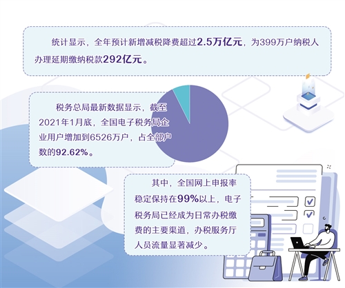 “辦好惠民實事”如何體現(xiàn)?減稅降費關系市場主體紓困解難,廣大企業(yè)特別是中小微企業(yè)期待著政策紅利進一步釋放。確保優(yōu)惠政策直達快享,正是“春風行動”的一項重要內容。2020年,在疫情發(fā)生后,國家出臺一系列有針對性的減稅降費政策,企業(yè)需要政策落實快、落實準、落實細。稅務總局明確提出“優(yōu)惠政策落實要給力”,以最快速度、最高效率確保政策紅利直達市場主體。統(tǒng)計顯示,全年預計新增減稅降費超過2.5萬億元,為399萬戶納稅人辦理延期繳納稅款292億元。