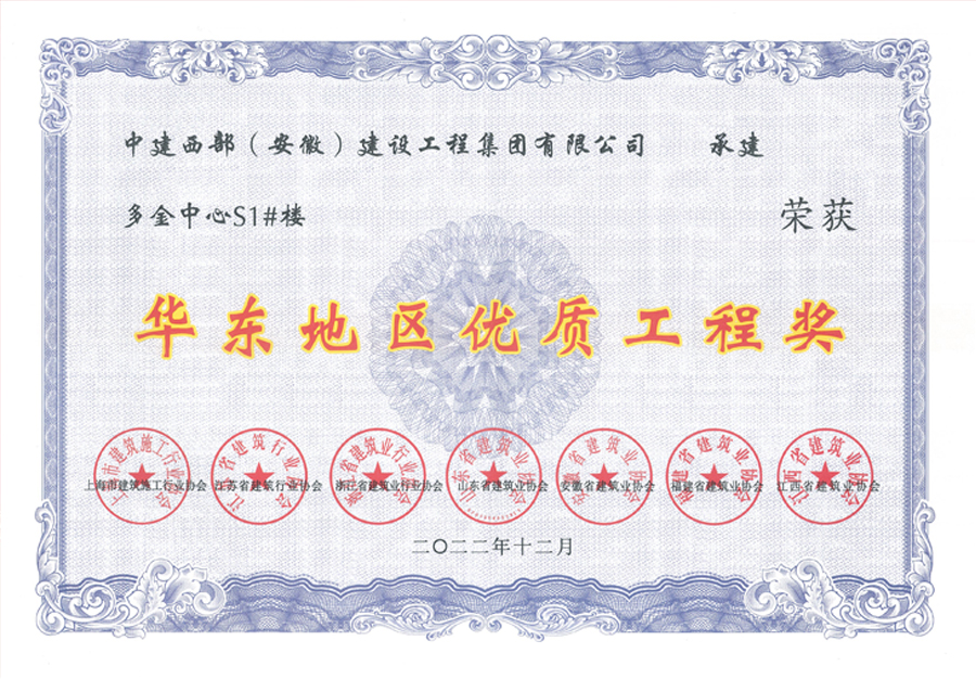 2022年度“華東地區優質工程獎”評審會已于2022年12月26日在山東濟南召開,經評審委員會投票表決,由中建西部(安徽)建設工程集團有限公司承建的多金中心S1#樓工程獲得2022年度“華東地區優質工程獎”。